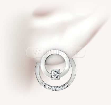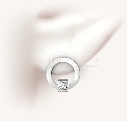 Hlavní částí jsou minimalistické náušnice ve tvaru malých, lesklých kruhů, ozvláštněných čtvercovými diamanty princess. Jako klasické náušnice je dříkem zasunete do ušního lalůčku a zajistíte šroubkem nebo puzetou.